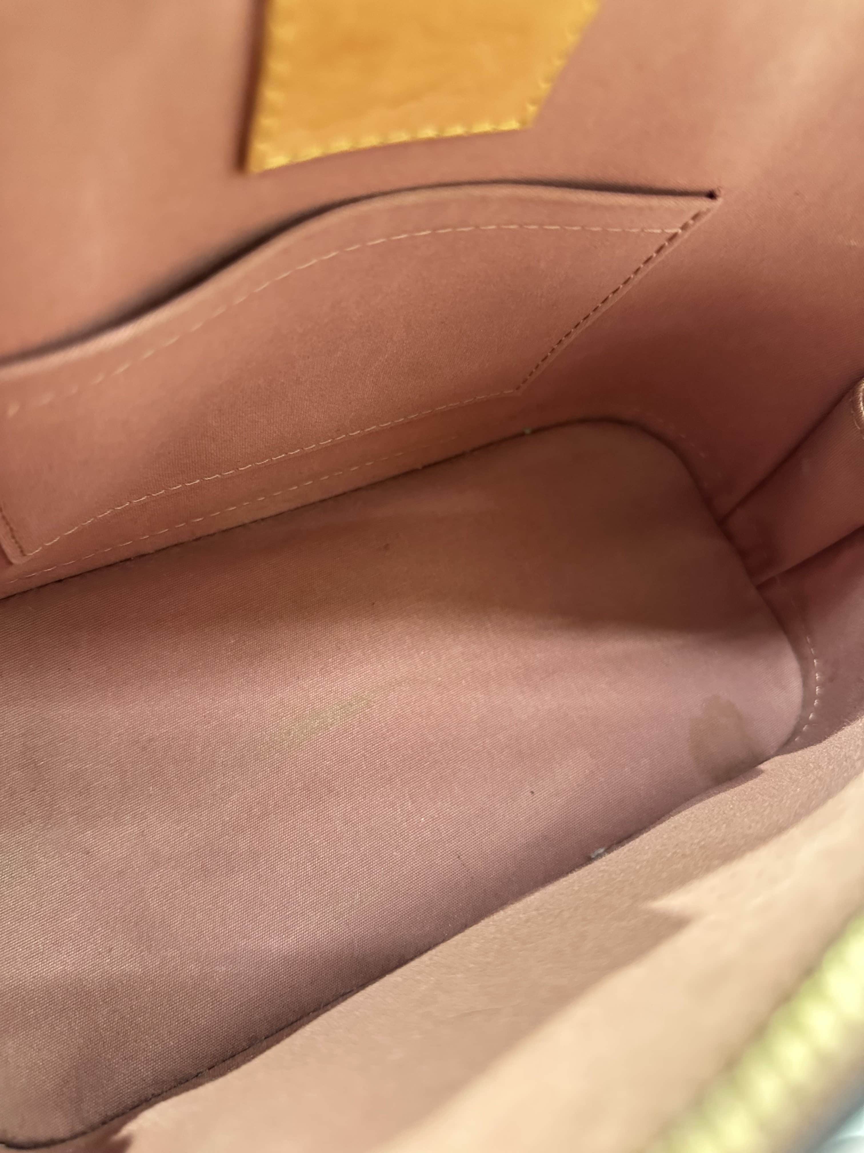 • Exterior condition: Very good. Slight signs of use. Stains. Scuffed on the corners. The patent leather shows a slight stickiness due to age and storage, common with this material.