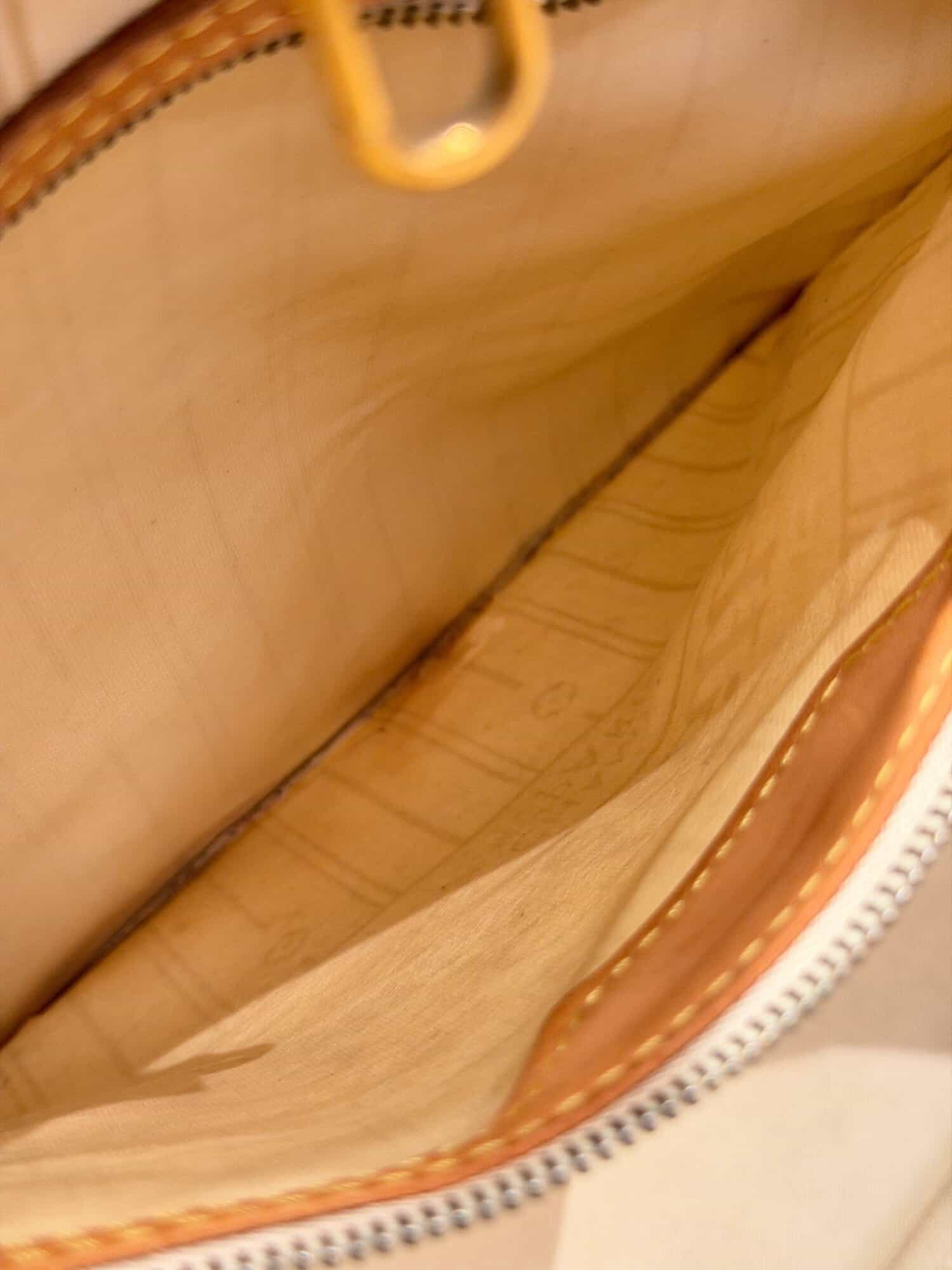 - Exterior condition: Very good.–Normal slight signs of use on the corners. The leather drawstring shows some minor cracking.